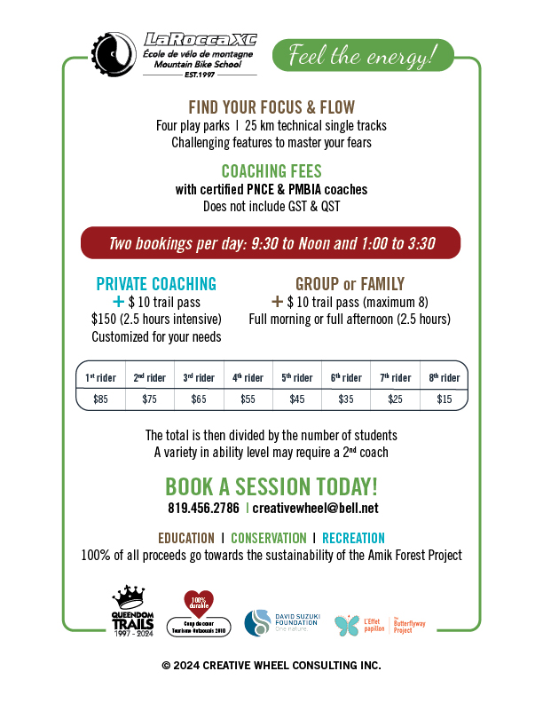 We are back in full form this coming Spring 2025 with many changes to the trail system, including a brand new road up the mountain (chemin Bernier), 100% sustainable. Summer camps, leadership programs, and a new offering for women (day or weekend option) called "The game changer". creativewheel@bell.net for more information. The team is excited to share their knowledge!