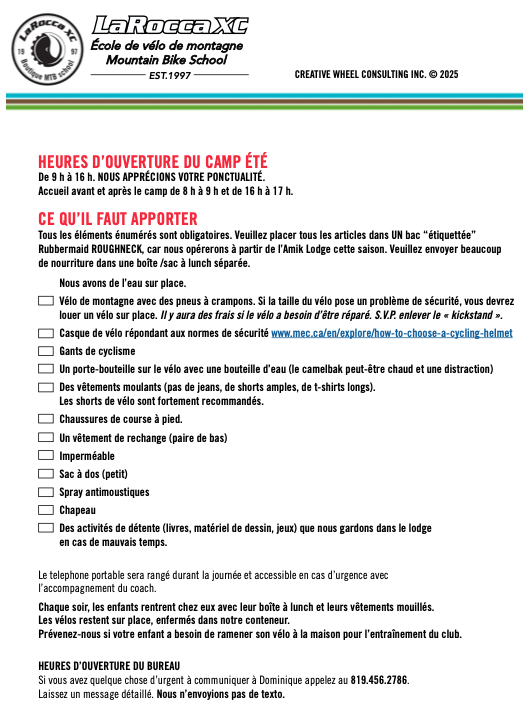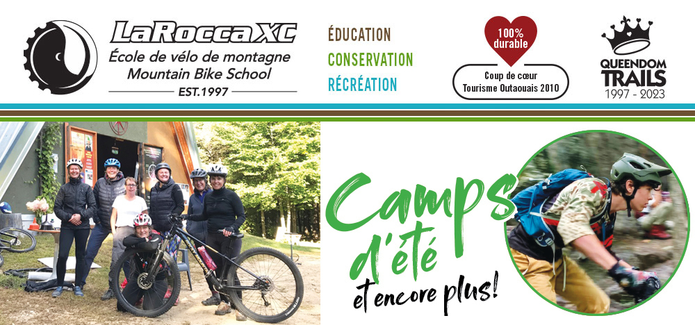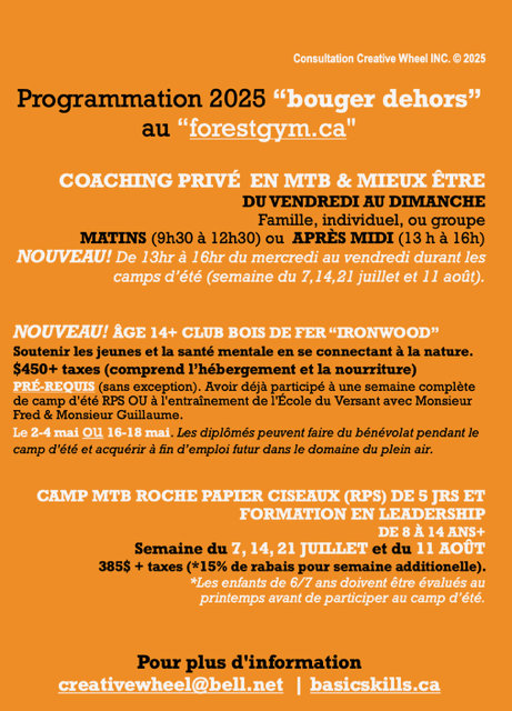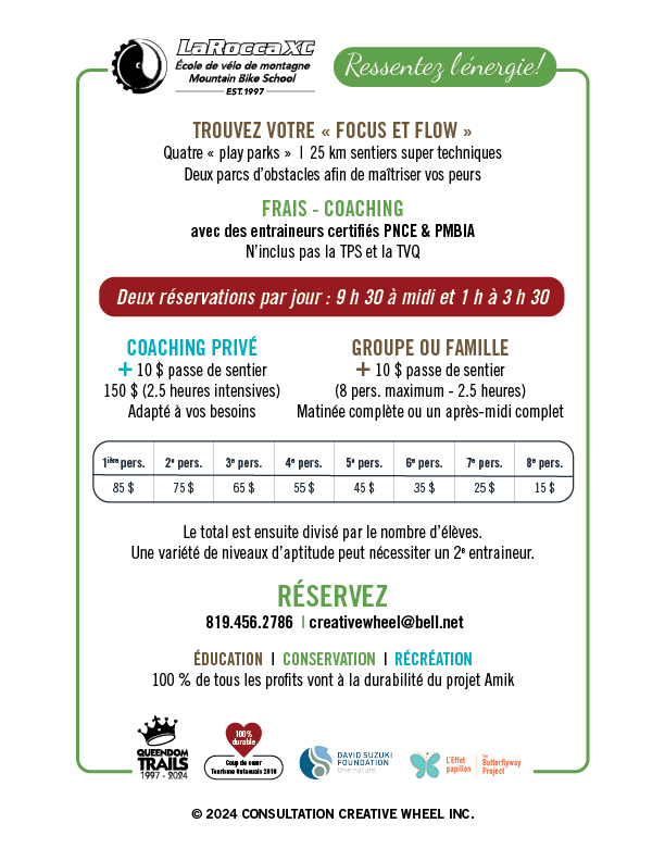 Nous sommes de retour en pleine forme au printemps 2025, avec de nombreux changements au réseau de sentiers, y compris une toute nouvelle route vers le sommet de la montagne (chemin Bernier), 100% durable. Des camps d'été, des programmes de leadership et une nouvelle offre pour les femmes (option de jour ou de fin de semaine) appelée « Le game changer ». Envoyez un courriel à creativewheel@bell.net pour plus d’information. L'équipe est enthousiaste à l'idée de partager ses connaissances !