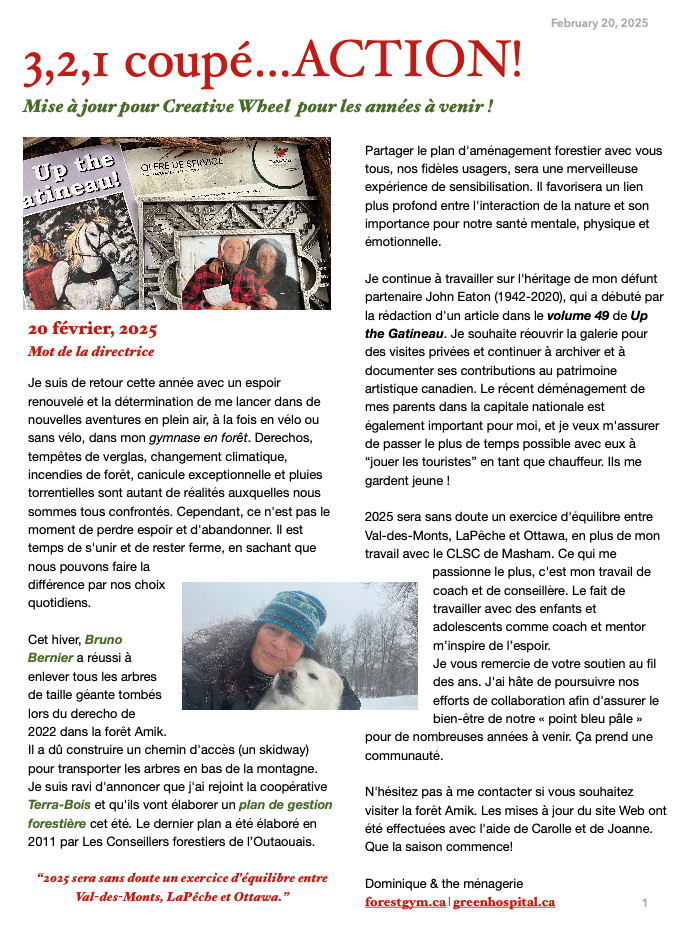 Nous sommes de retour en pleine forme au printemps 2025, avec de nombreux changements au réseau de sentiers, y compris une toute nouvelle route vers le sommet de la montagne (chemin Bernier), 100% durable. Des camps d'été, des programmes de leadership et une nouvelle offre pour les femmes (option de jour ou de fin de semaine) appelée « Le game changer ». Envoyez un courriel à creativewheel@bell.net pour plus d’information. L'équipe est enthousiaste à l'idée de partager ses connaissances !